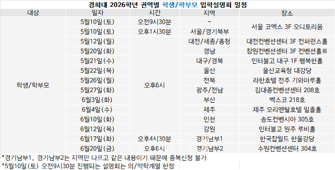 [베리타스알파=박한성 기자] 경희대가 2026학년 권역별 학생/학부모 입학설명회 일정을 공개했다. 설명회는 5월10일 오전9시30분 의약학계열 설명회를 시작으로 6월20일까지 총 14회로 예정됐다. 서울/경기북부부터 대전/세종/충청 경남 대구/경북 울산 전북 광주/전남 부산 제주 인천 강원 경기남부 등 전국 여러 지역에서 진행된다.
