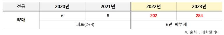 약대 중도탈락 인원은 ‘PEET(약학입문시험) 체제’였던 2020년과 2021년은 각각 6명, 8명이었지만 6년제 학부 전환 후의 2022년 중도탈락은 202명, 2023년 중도탈락은 284명으로 전년보다 82명 증가(2년 새 35.5배 급증)했다. 의치대 진학을 위해 반수/재수(N수)로 이탈했기 때문이다.