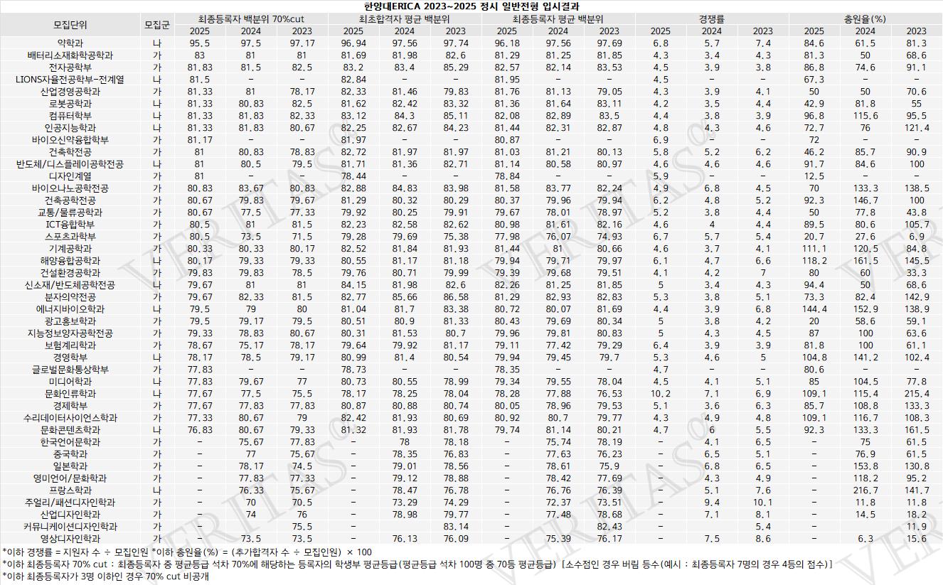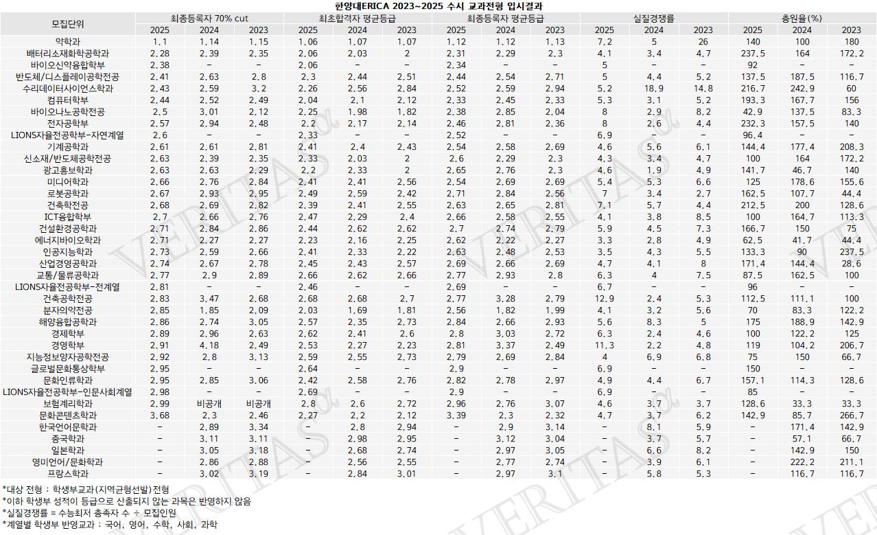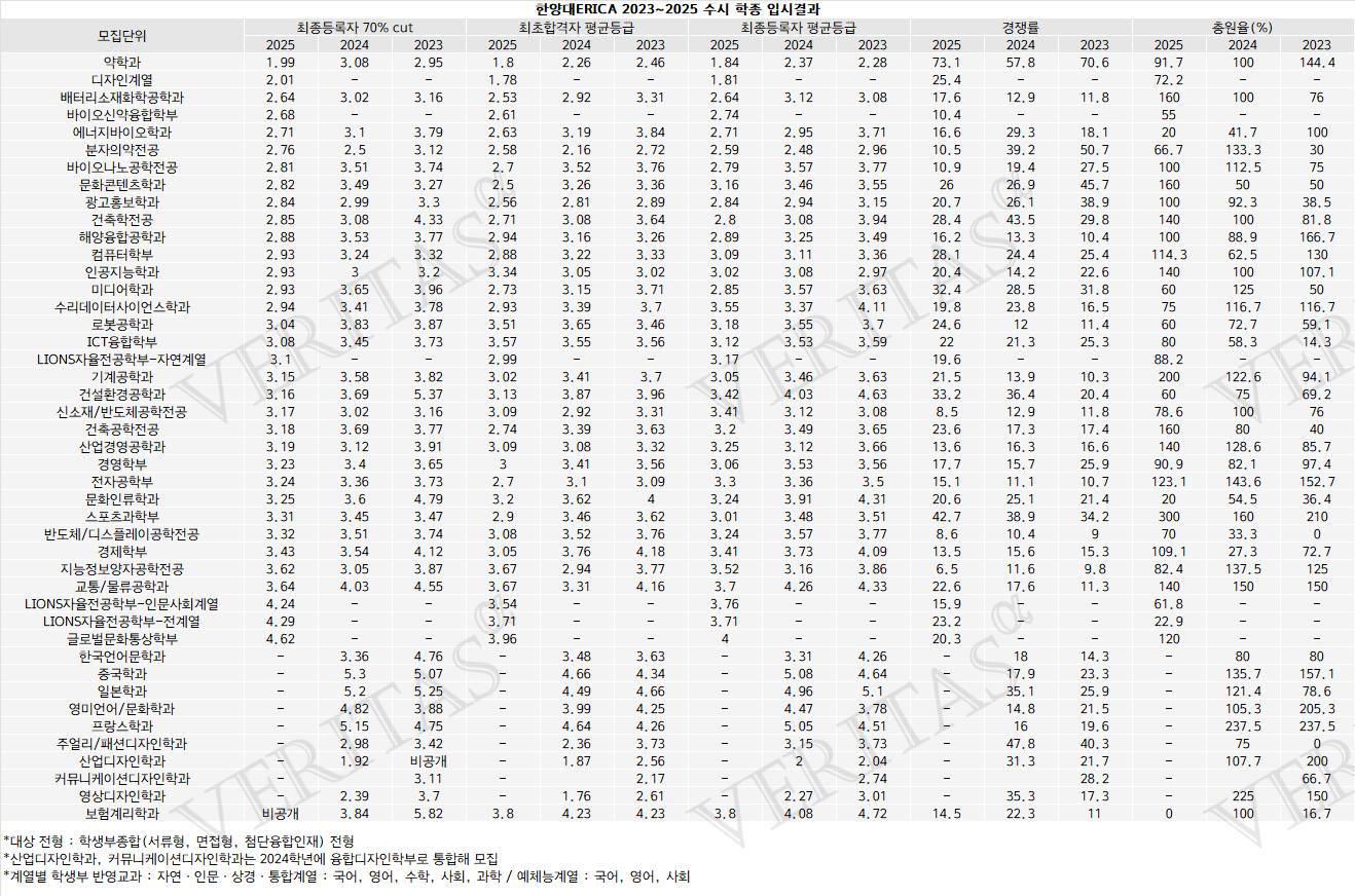 [베리타스알파=신현지 기자] 2025학년 한양대ERICA의 입시결과를 살펴보면, 정시 수능전형과 수시 교과전형 학종 모두 약학과가 톱을 휩쓸었다. 특히 수시에서의 합격선 상승세가 돋보인다. 교과전형인 지역균형선발에서는 최종등록자 학생부 70%컷이 2023학년 1.15등급, 2024학년 1.14등급, 2025학년 1.1등급 순으로 상승세이며, 학종은 2024학년 3.08등급에서 2025학년 1.99등급으로 상승했다. 정시 수능전형 일반은 수능 백분위 70%컷 기준 95.5로 전년 97.5보단 하락했지만 톱을 지켰다. 한양대ERICA는 최근 3년간 입결과 2026전형안내, 합격생들이 전하는 학종 대비법 등을 담은 2026학종가이드북을 8일 공개했다.