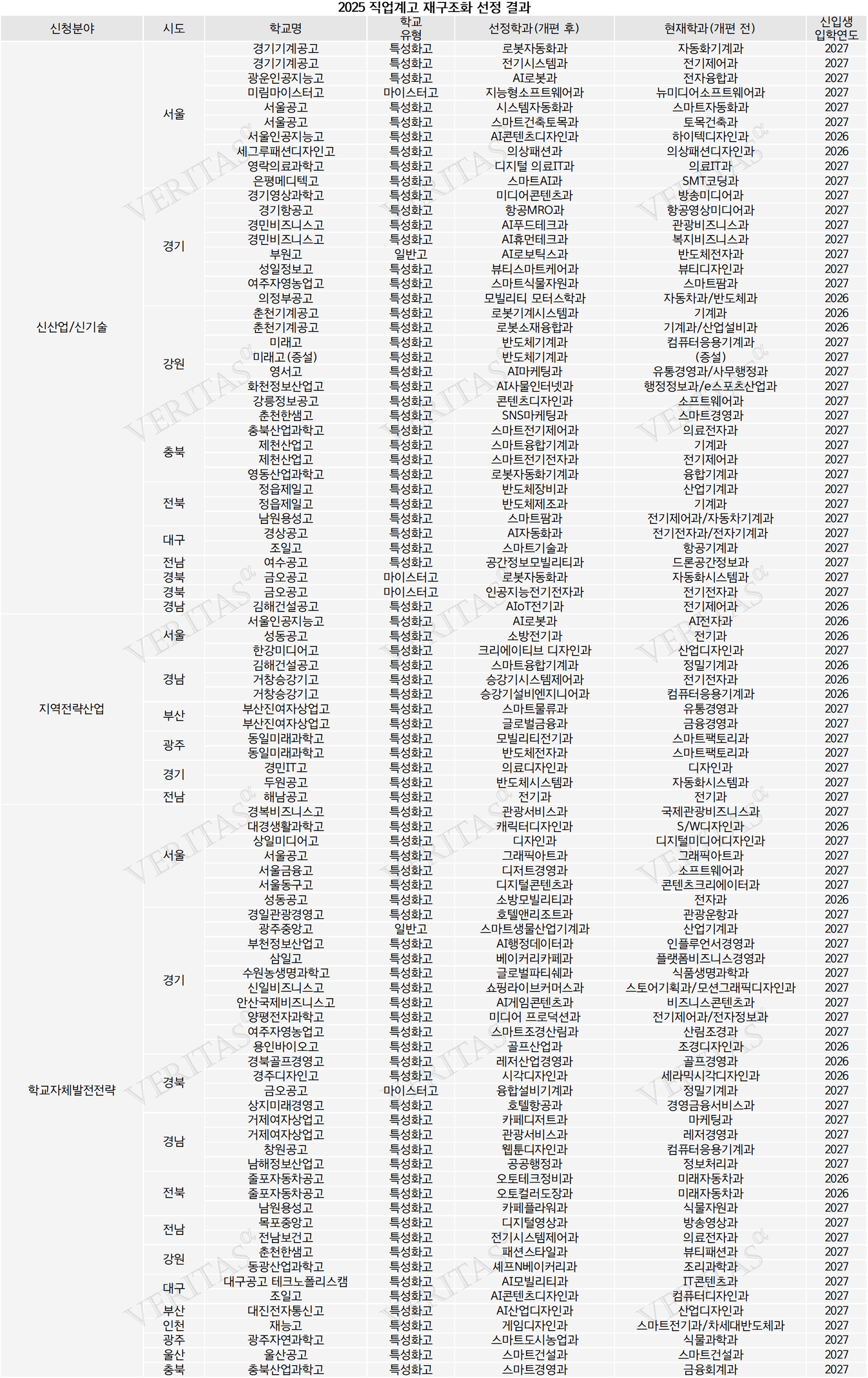 [베리타스알파=이상현 기자] 산업구조 변화에 대응한 직업계고 학과 개편을 지원하는 ‘직업계고 재구조화 지원 사업’에 올해 재능고 금오공고 등 68개교 91개 학과가 선정됐다. 91개 학과 중 90개 학과는 학과 개편, 1개 학과는 학급 증설 방식으로 지원이 이뤄질 예정이다. 유일하게 학급을 증설하는 곳은 미래고 반도체기계과다. 학과 개편 학급에는 각 3억7500만원, 학급 증설대상에는 2억2500만원을 지원한다. 교육부는 이같은 내용을 담은 '2025 직업계고 재구조화 선정 결과'를 10일 공개했다.