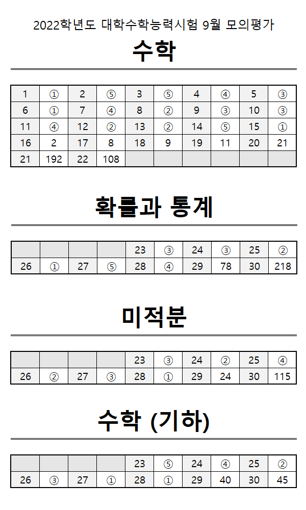 2022 9월모평 정답 고3 수학