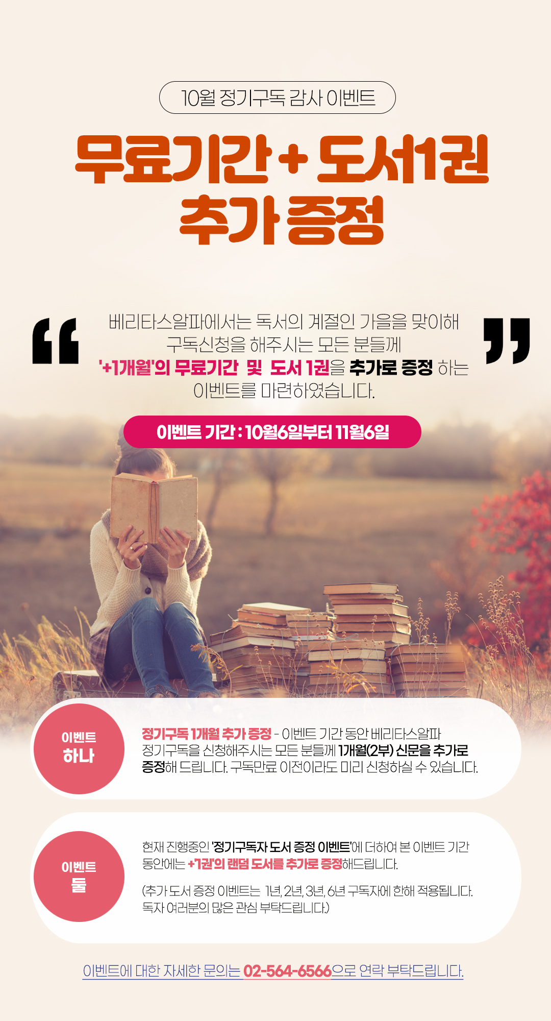베리타스알파가 독서의 계절인 가을을 맞이해 구독신청을 해주시는 모든 분들께 ‘+1개월’의 무료기간을 증정하는 이벤트를 마련했습니다. 특히 올해 코로나19 장기화로 힘들어하시는 모든 교육가족을 응원하고자 ‘도서1권’을 추가로 증정해드리는 이벤트도 함께 진행합니다. 이벤트 기간은 10월6일부터 11월6일까지 입니다.