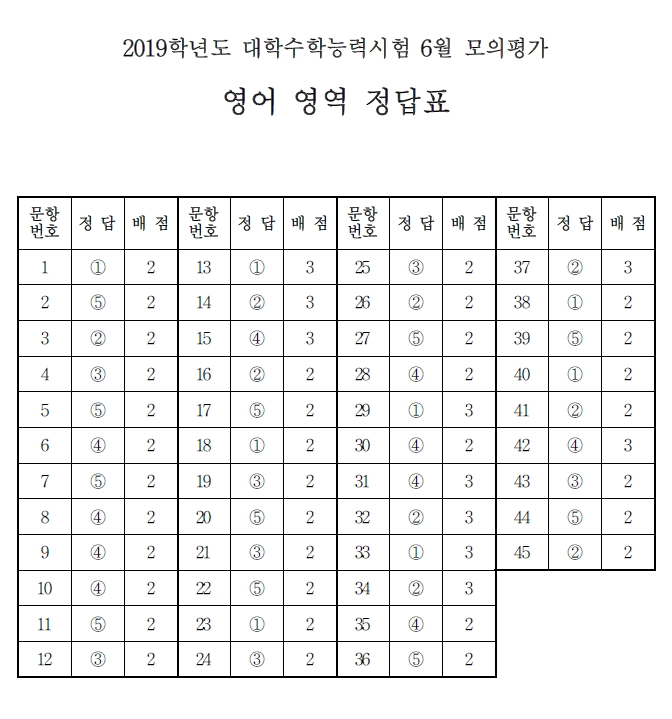 2018년 6월 모의고사(6월 모평) 영어 답지.