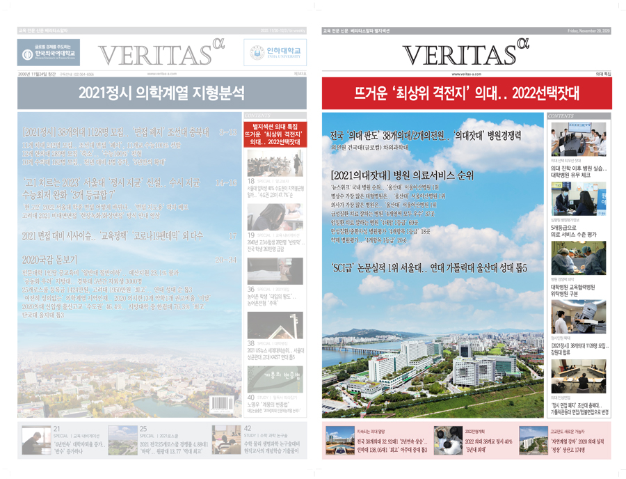 베리타스알파는 올해 처음으로 2022입시를 겨냥한 의대특집(별지 28페이지)을 발행합니다. 전국 38개의대 2개의전원으로 구분된 의대 판도를 정리해 담았습니다. 특히 올해는 의대 정원 확대 이슈가 여전히 뜨거운데다, 정시 확대가 추진되면서 의대를 향한 관심이 더욱 높아지고 있습니다. 의대에 대한 열망이 그 어느 때보다 높아진 지금, 의대 선택에 있어 고려해야 할 ‘의대잣대’의 필요성이 커지는 배경입니다. 베리타스알파는 병원순위, 건강심사보험평가원의 병원평가정보 등을 활용해 병원의 경쟁력을 분석했습니다. 의대 진학을 목적으로 한 수험생들의 실력차가 크지 않다는 점을 고려하면 의대 선택에 있어서 단순히 ‘입결’보다는, 보유 병원수와 병원평가결과 등 다양한 ‘의대잣대’를 통해 고려해볼 필요가 있다는 판단 때문입니다. 2022 의대특집이 수험생활과 학생 지도에 도움이 되길 바랍니다.