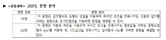 공통문항은 5지선다형 15문항, 단답형 7문항 출제되었다. 그림을 이용한 문항은 6문항 출제되었고, <보기> 문항은 삼각함수 단원에서 출제되었다. 빈칸 문항은 수열 단원에서 출제 되었으며 주어진 조건을 만족시키는 값을 구하는 과정을 추론하는 문항으로 출제되었다. 2021 수능과 동일한 범위에서는 기존 출제 유형과 유사하게 출제되었다.