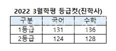 원점수컷은 공통+선택과목 조합에 따라 바뀔 수 있으므로 특정 점수로 예측하기 어렵다. 진학사가 예측한 원점수 1등급컷은 국어는 90점, 수학은 81점이다.