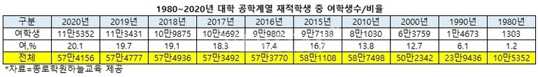 <2020년 공학계열 재적 여학생 20.1%.. ‘역대 최고’>