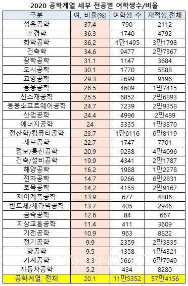 공학계열 중에서는 섬유공학 재적 여학생이 2112명 중 790명으로 37.4%의 비중을 차지해 가장 비율이 컸다. 이어 조경학 36.3%(1740명/4792명), 화학공학 36.2%(11495명/31798명), 건축학 34.6%(9477명/27367명), 광학공학 31.1%(1147명/3684명) 순으로 톱5였다. 반면 가장 여학생 비율이 낮은 것은 자동차공학으로 전체 8280명 중 여학생이 434명으로 5.2%에 불과했다. 이어 기계공학 8.3%(5661명/67949명), 항공학 9.5%(1358명/14321명), 전기공학 9.9%(2359명/23835명) 순으로 10%미만이었다.