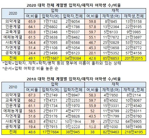 2020년 기준 대학 전체 계열별 입학 여학생 비율은 의약계열이 65.9%로 가장 높았다. 2만6054명의 입학자 가운데 여학생이 1만7182명이었다. 이어 인문계열 64.1%(2만6802명/4만1786명), 교육계열 63.8%(1만2346명/1만9337명), 예체능계열 61.5%(2만3638명/3만8462명), 사회계열 54.4%(4만7095명/8만6568명), 자연계열 51.4%(2만1108명/4만1054명), 공학계열 24.4%(2만3496명/9만6123명) 순으로 나타났다. 2010년에는 의약계열 67.3%(1만2749명/1만8947명), 교육계열 66.2%(1만4721명/2만2253명), 인문계열 61.1%(3만1734명/5만1970명), 예체능계열 58.5%(2만6177명/4만4777명), 자연계열 51.6%(2만5176명/4만8826명), 사회계열 48.3%(4만9212명/10만1944명), 공학계열 19.4%(1만7915명/9만2228명) 순이다.