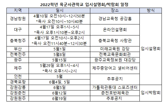 입시설명회/박람회는 설명회 6회, 박람회 3회 총 12회가 예정됐다. 지역별로 ▲경남 창원 4월10일 ▲대구 4월17일 ▲충북 청주 4월17일 ▲부산 5월1일 ▲전북 전주 5월8일 ▲광주 5월15일 ▲제주 5월29일 ▲인천 5월 ▲경북 포항 6월4일/5일이고 입시박람회는 ▲강원 강릉 6월5일 ▲강원 춘천 6월19일 ▲강원 원주 6월19일이다. 신청은 주관 시도교육청으로 문의해 신청 가능하며 일시와 장소가 미정인 경우 구체화되는 대로 육사 홈페이지를 통해 공지할 예정이라고 밝혔다.