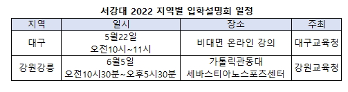 [베리타스알파=김하연 기자] 서강대는 지역별 입학설명회 일정을 최근 공개했다. 설명회는 ▲5월22일 대구 ▲6월5일 강원 강릉 지역에서 열릴 예정이며 참가 신청은 각 주최기관에 문의/접수하면 된다. 그외 지역에서 열리는 설명회는 확정시 추후 홈페이지를 통해 공지할 예정이라고 밝혔다.