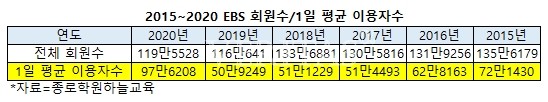 EBS 수능강의 전체 회원수도 늘었다. 119만5528명으로 전년 116만641명보다 3만4887명(3.0%) 증가했다. 2015년 이후 2019년까지 학령인구 감소에 따라 대체로 감소 추이에 있었으나, 이례적으로 2020년은 전체 회원수도 증가한 모습이다.