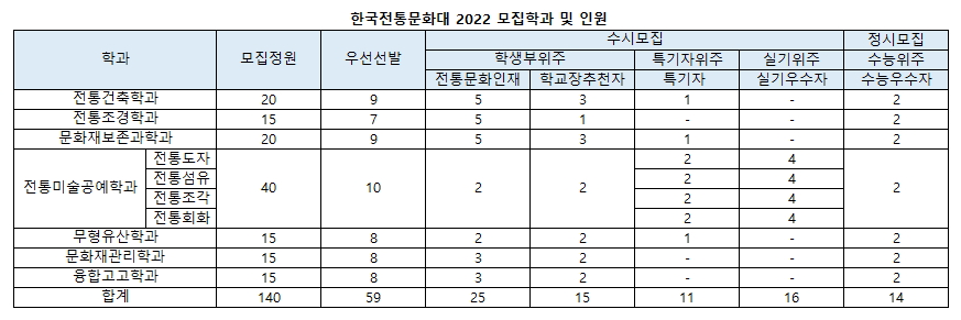 2022전통문화대 모집요강에 따르면 올해 모집인원은 총140명이다. 전체 모집인원에는 변화가 없지만 수능우수자 신설로 전형별 모집인원에 변화가 있다. 우선선발 59명, 수시 전통문화인재 25명 학교장추천자15명 특기자11명 실기우수자16명, 정시 수능우수자 14명이다. 전년 대비 우선선발(일반전형)5명 전통문화인재4명 학교장추천자(추천자) 8명이 줄고, 특기자3명과 수능우수자전형14명이 늘어난 모습이다. 지난해 전형별 모집인원은 일반전형 64명, 전통문화인재29명 추천자23명 특기자8명 실기우수자16명이었다.