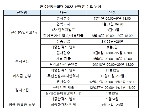 전통문화대는 교육부 산하가 아닌 경찰대학과 육/해/공/간호 등 4개 사관학교, KAIST(한국과학기술원) GIST대학(광주과학기술원) DGIST(대구경북과학기술원) UNIST(울산과학기술원) 등 과학기술원과 마찬가지로 특별법에 설립근거를 둔 특수대학으로 분류된다. 일반대학과는 다른 독자적인 입시를 진행할 수 있는 이유다. 전통문화대는 2022대입에서 정원내 기준 우선선발 59명, 수시(전통문화인재25명/학교장추천자15명/특기자11명/실기우수자16명) 97명, 정시(수능우수자)14명 등 총140명을 선발한다. 올해 우선선발5명 수시9명을 축소하고 수능우수자14명으로 이동했다. 전형방법은 큰틀에서 동일하지만 수시모집에서 세부 변경 사항이 있다. 학생부 없는자를 대상으로 치러지는 기초능력평가고사를 폐지하고 대신 검정고시 합격점수 내신등급을 적용한다. 성적 산출이 불가한 자의 경우 자체 환산점수를 사용한다. 학생부 반영 비율도 작년 1학년40% 2학년60% 3학년미반영에서 올해 1학년20% 2학년40% 3학년1학기40%로 변화했다.