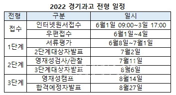 2022 전형요강에 따르면 올해 경기과고 모집인원은 정원 내 일반전형 120명이다. 정원 외는 추천관찰전형으로 정원의 10%인 12명 이내를 모집한다.