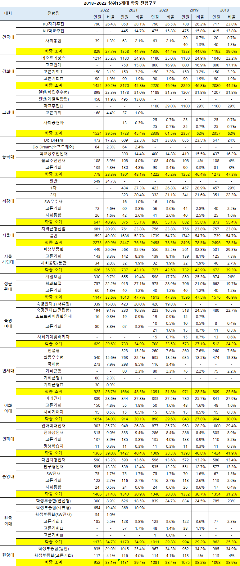 고른기회 성격의 전형을 제외하고 3개전형을 운영하는 곳은 동국대(DoDream DoDream(소프트웨어) 불교추천인재) 숙명여대(숙명인재Ⅰ(서류형) 숙명인재Ⅱ(면접형) 소프트웨어융합인재) 중앙대(다빈치형인재 탐구형인재 SW인재)다. 2개전형을 운영하는 곳은 고려대(일반(학업우수형) 일반(계열적합형) 서울대(지균 일반) 성균관대(계열모집 학과모집) 연세대(활동우수형 국제형) 인하대(인하미래인재 인하참인재)다.