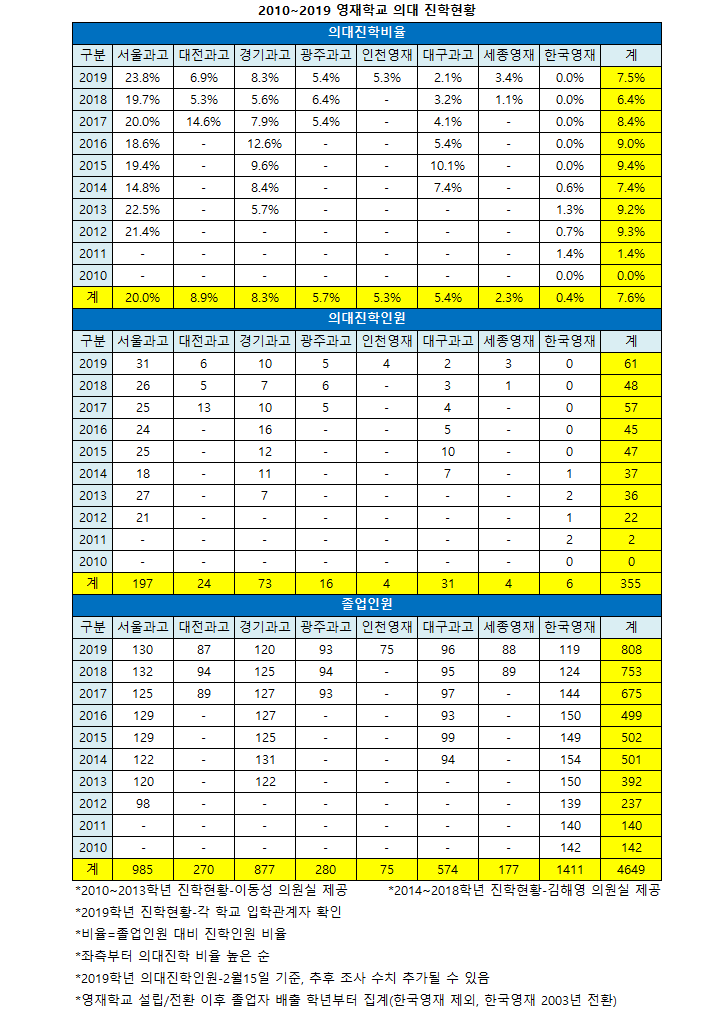 영재학교 졸업생의 의대진학 문제는 매년 되풀이되고 있다. 2019학년 베리타스알파가 자체조사한 결과, 영재학교 8개교의 의대진학인원이 역대 최대 규모를 기록한 것. 전체 졸업생이 7.5%인 61명이 의대에 진학한 것으로 알려졌다. 특히 재수생 인원이 완전히 파악되지 않은 2019년 2월 조사임에도 불구하고 서울과고는 23.8%(의대진학자 31명/졸업생 130명)의 의대진학율을 기록, 졸업생 4명 중 1명이 의대에 진학한 것으로 파악돼 충격을 준 바 있다. 경기과고 8.3%(10명/120명), 대전과고 6.9%(6명/87명), 광주과고 5.4%(5명/93명), 인천영재 5.3%(4명/75명) 등이다. 영재학교 8개교는 2020학년부터 의약학계열 진학 실적을 공개하지 않겠다는 방침을 밝혔다. 다만 2021학년 서울대 정시모집에 영재학교 출신 N수생 규모가 확대됐다는 점을 고려, 영재학교 학생들의 의학계열 진학 역시 2019학년과 비슷한 규모를 유지했을 것으로 보인다. 고등 교육과정과 상이한 영재학교 교육 특성상, 영재학교 출신 학생들은 대부분 재수를 통해 의대진학을 꾀하기 때문이다.