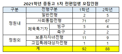 [베리타스알파=김하연 기자] 중동고는 2021학년 1차 전편입생 모집을 진행한다고 최근 밝혔다. 올해 모집인원은 1학년 92명 2학년 88명 모두 180명이다. 정원내 기준 일반전형 1학년2명 2학년5명, 사회통합전형 1학년71명 2학년67명이고 체육특기자전형의 경우 빙구 1학년5명 2학년4명 축구 1학년2명 2학년2명이다. 정원외 모집은 보훈자자녀(국가유공자) 1학년11명 2학년9명 고입특례대상자 1학년1명 2학년1명이다.
