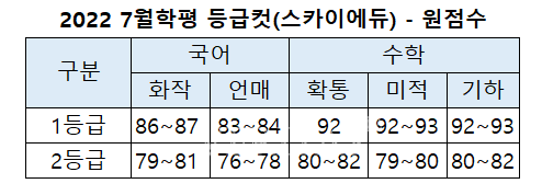 [베리타스알파=권수진 기자] 스카이에듀가 발표한 8시8분 기준 2021 7월 모의고사 원점수 기준 예상 1등급컷은 국어 화법과작문 86~87점, 언어와매체 83~84점, 수학 확률과통계 92점, 미적분 92~93점, 기하 92~93점이다.