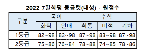 [베리타스알파=권수진 기자] 대성이 발표한 8시48분 기준 2021 7월 모의고사 원점수 기준 예상 1등급컷은 국어 화법과작문 82~98점, 언어와매체 82~98점, 수학 확률과통계 87~98점, 미적분 83~98점, 기하 87~98점이다.