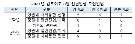 [베리타스알파=김하연 기자] 김포외고는 2021학년 8월 전편입생 모집을 진행한다고 최근 밝혔다. 1, 2학년 대상 사회통합전형 일반전입/귀국, 일반귀국 3개 전형이다. 모집인원은 1학년 21명, 2학년 26명이고 3학년 전편입학 모집은 별도 전화문의 가능하다. 지원 자격은 지원학년과 동일하거나 그 이상의 학력을 수료한 자료 정원내 경우 전 가족이 경기도에 거주해야 하고 정원외는 현재 김포시에 거주해야 한다. 전편입 신청은 8월17일, 18일 방문접수 또는 우편으로 접수한다. 면접은 8월19일 오후4시40분 원격면접을 진행한다. 합격자는 면접일로부터 5일 이내 개별 통보한다.