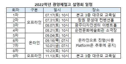 2022학년 광양제철고 신입생 설명회 일정은 17일부터 11월13일까지 총9회다. 1차~4차, 9차는 오프라인, 5~8차는 온라인 방식이다. 회차별 일정은 17일 10시 광양제철고 3층 교육실, 31일 10시 창원 문성대 컨벤션홀, 8월7일 10시 광주디자인센터 이벤트홀, 8월21일 10시 순천문화예술회관 소극장이다. 온라인 설명회인 5~6차의 경우 5차 9월4일 10시, 6차 9월16일 7시, 7차 10월1일 7시, 8차 10월23일 10시다. 9차는 11월13일 광양제철고 3층 교육실이다.