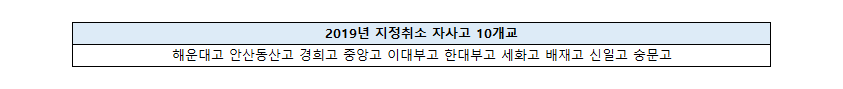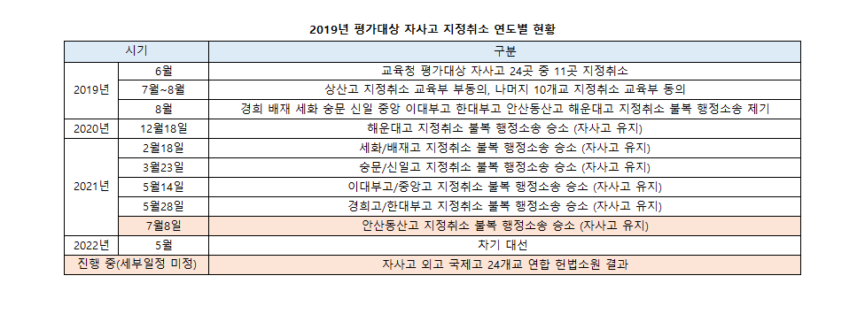 2019년 각 시/도 교육청의 자사고 재지정평가를 통해 지정취소가 이뤄진 곳은 총 10개교다. 서울8개교(경희고 배재고 세화고 숭문고 신일고 이대부고 중앙고 한대부고)와 경기 안산동산고, 부산 해운대고, 전주 상산고다. 이중 교육부의 부동의로 인해 자사고 지위를 유지한 상산고를 제외한 10곳이 재지정평가를 통해 강제로 지정취소됐다. 10개교 모두 지정취소에 불복하며 2019년 8월 지정취소 불복 행정소송을 제기, 10개교 모두 1심에서 승소하며 자사고 지위를 유지하게 됐다. 경기교육청은 “고교교육 정상화와 미래교육이라는 시대적 흐름을 거스르는 결과라며 이번 판결이 불공정한 교육 상황과 서열화된 입시 경쟁체제에 면죄부 역할을 한다”며 항소하겠다는 입장이다.