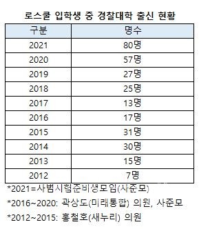 2021년 로스쿨 입학자 중 경찰대학 출신은 총 80명이다. 25개로스쿨 중 경찰대학 출신 입학자수가 가장 많은 곳은 11명으로 나타난 원광대다. 원광대 다음으로는 성균관대가 10명으로 두 로스쿨이 10명이상이다. 이어 경희대(9명)까지 톱3다.