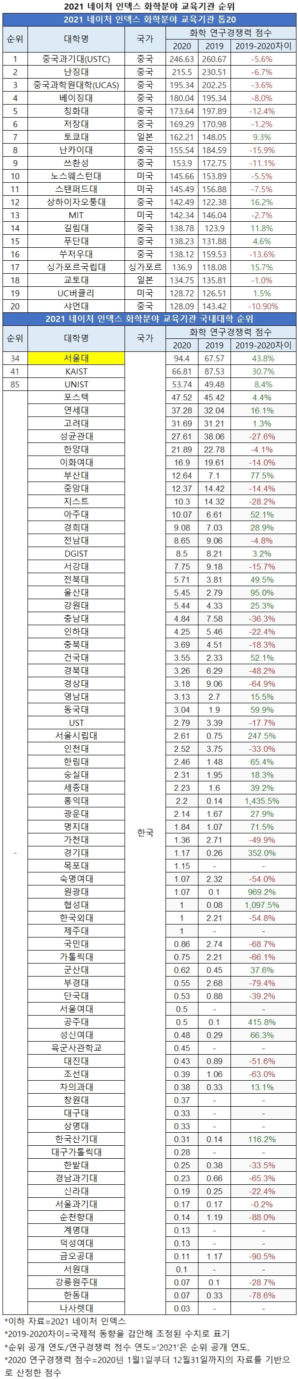 화학 분야에서 세계 톱100 내에 자리한 국내대학은 서울대 KAIST UNIST의 3개교다. 각 34위 41위 85위를 기록했다. 2020년 연구경쟁력 점수는 서울대(94.4점) KAIST(66.81점) UNIST(53.74점) 순이다.