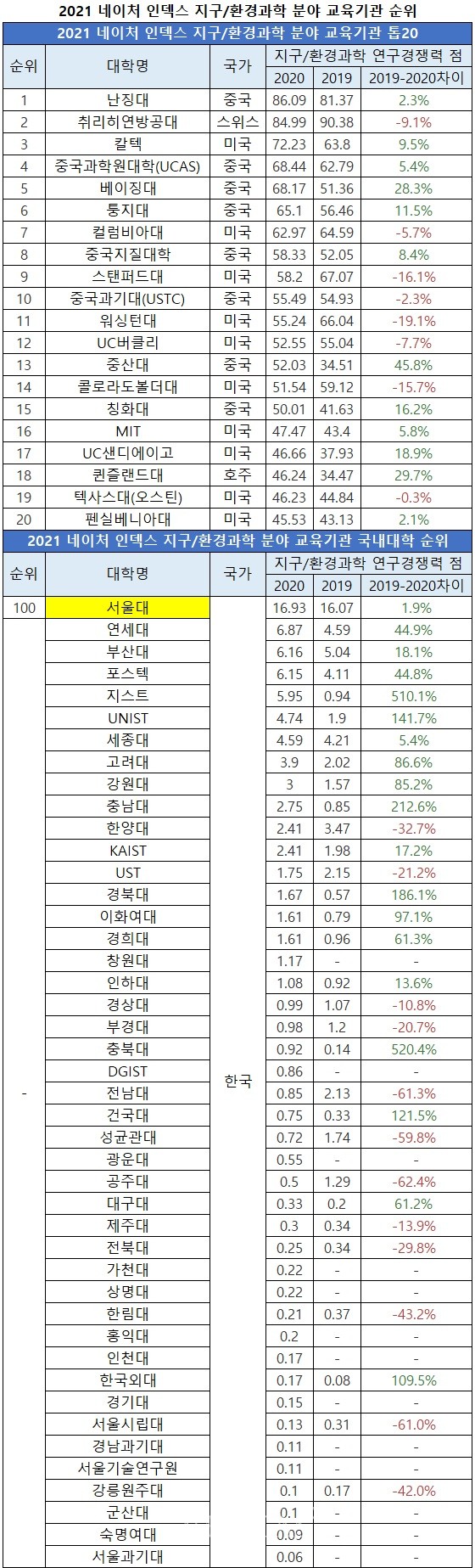 네이처 인덱스는 과학 저널 ‘네이처’가 발표하는 대학/연구기관의 연구경쟁력 지표다. 국제 유력 학술지 82개에 논문을 발표한 연구자의 소속기관, 공동 저자의 기여도, 학문분야별 가중치 등을 분석해 연구성과를 객관적 수치로 제시한다. 기관별 수치를 토대로 순위도 매겨 공개하고 있다. 기초과학 분야에서 권위 있는 지표로 평가되는 만큼 분야별 대학의 경쟁력을 파악하는 데 충분히 활용 가능하다. ‘2021 분야별 순위’는 ‘2020년 연구경쟁력 점수’에 의한 순위로, ‘2021순위’와 동일하지만 분야별로 구분한 수치의 순위다. ‘2020년 연구경쟁력 점수’는 2020년 1월1일부터 12월31일까지의 자료를 기반해 산정한 점수다. ‘순위 공개 연도’와 ‘순위 산정에 활용된 자료의 시기’를 혼동하지 않도록 유의해야 한다. 같이 순위가 공개됐던 2021 네이처 인덱스 교육기관 순위의 경우 지난해(2020년) 서울대 KAIST 연대 포스텍 UNIST가 국내톱5를 기록했다.