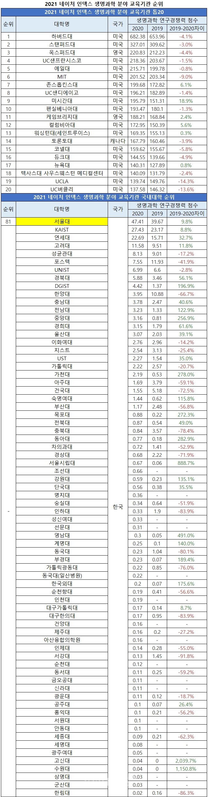 생명과학 분야에서도 서울대가 유일하게 세계 톱100 내에 자리했다. 생명과학 연구경쟁력 점수 47.41점으로 세계81위를 기록했다. 2019년 점수 39.67점보다 9.8% 증가한 수치다.