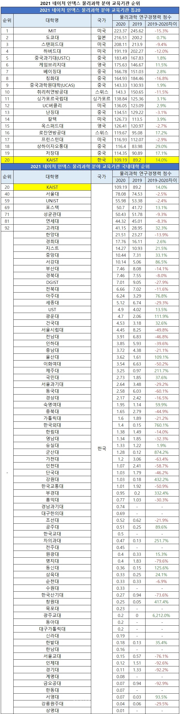 물리과학 분야에서는 KAIST가 세계20위를 기록해 국내1위를 기록했다. 국내대학 중 유일하게 톱20에 이름을 올리기도 했다. 연구경쟁력 점수는 109.19점으로 국내대학 중 유일하게 100이상을 기록했다. 이어 40위 서울대(78.08점), 59위 UNIST(55.98점), 69위 포스텍(50.7점), 71위 성균관대(50.43점), 81위 연세대(44.32점), 92위 고려대(41.15점) 순으로 톱100 내에 자리한 국내대학이다.