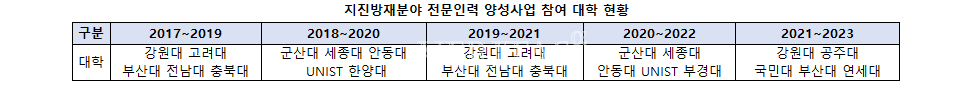 지진방재분야 전문인력 양성사업은 2017년부터 추진, 현재 강원대 고려대 군산대 부경대 부산대 세종대 안동대 전남대 충북대 UNIST의 10개대학이 참여 중이다. 이 가운데 강원대 고려대 부산대 전남대 충북대 등 5개교의 사업이 8월 종료됨에 따라 행정안전부는 공모를 통해 5개교를 새로 선정했다. 공모는 지난 6월 내/외부 전문가로 구성된 심의위원회를 통해 진행됐다. 기존 참여대학이었던 강원대 부산대는 공모를 통해 재선발됐으며, 공주대 국민대 연세대의 3개교는 신규 선발이 이뤄졌다.