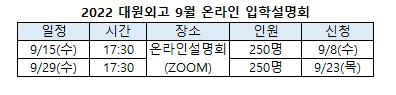 참가인원은 설명회 당일 오후4시에 ID또는 링크주소를 휴대폰으로 발송한다. 설명회 시작 전 모의테스트를 진행하므로 참가자들은 5시부터 ZOOM에 사전신청한 이름으로 접속을 완료해야 한다. 시스템이 불안정할 경우, 5시20분에 구글미트로 전환한다. 대원외고 관계자는 "9월 입학설명회는 코로나19로 인해 비대면 실시간 원격설명회로 2회 진행한다. 많은 관심 부탁 드린다"고 말했다.