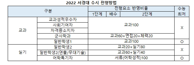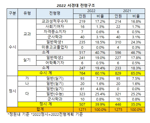 서경대는 2022수시에서 정원내 764명을 모집한다. 수시/정시 합산 60.1% 규모다. 지난해 829명(65%)보다 모집인원이 65명 줄었다. 교과전형은 작년 46.7%에서 올해 40.7%로 축소되고 실기전형은 작년 18.3%에서 올해 19.4%로 확대됐다. 전형별로 구분하면 교과전형은 교과성적우수자219명(17.2%) 사회기여자16명(1.3%) 자격증소지자7명(0.6%) 군사학과40명(3.1%) 일반학생(1)235명(18.5%)으로 총517명(40.7%)을 선발한다. 실기전형은 일반학생(2)241명(19%) 어학특기자6명(0.5%)으로 총247명(19.4%)를 선발한다.