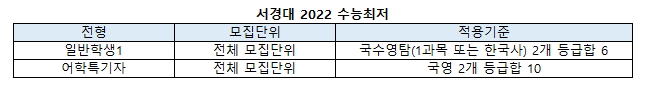 서경대의 2022수시 원서접수는 9월10일 오전10시에 시작해 14일 오후5시까지 진행한다. 서류는 17일 오후4시까지 제출을 완료해야 한다. 군사학과 면접고사는 10월8일부터 10일까지 실시한다. 실기고사는 모집단위별로 10월1일부터 31일까지 진행된다. 최초합격자 발표는 수능최저가 없는 일반학생2 교과성적우수자 군사학과 사회기여자 자격증소지자전형의 경우 11월16일 오후5시에 홈페이지를 통해 발표한다. 수능최저가 있는 일반학생1과 어학특기자는 12월16일 오후5시 발표한다. 충원합격자발표는 12월21일부터 27일까지다.
