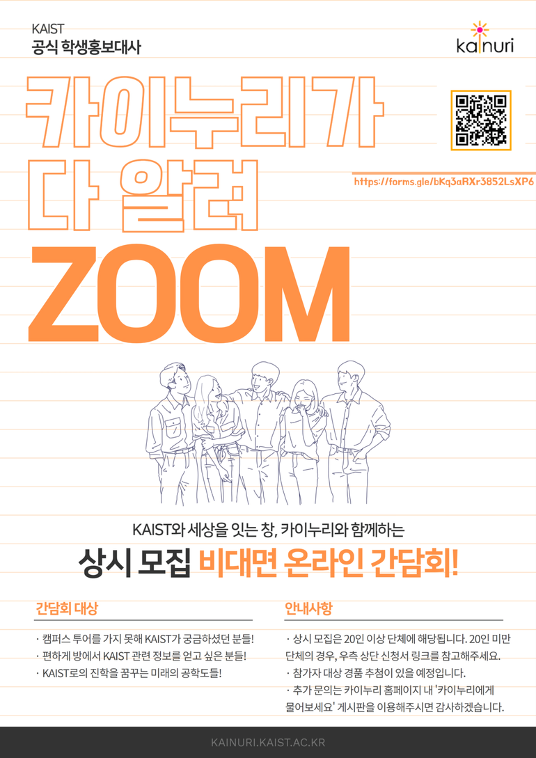 [베리타스알파=김하연 기자] KAIST는 2022 온라인 ‘카이누리가 다 알려 ZOOM’을 진행한다고 최근 밝혔다. 이달 25일과 10월23일 11월27일 각 오후1시부터 KAIST 공식 학생 홍보대사 카이누리가 비대면 온라인 간담회를 진행한다. 오후1시부터 2시30분까지 40여 분 간 온라인 간담회와, 50분 동안 질의응답을 통해 KAIST에 대한 정보를 제공한다. 신청은 행사일 이틀 전까지 홈페이지에 공지한 구글 설문을 통해 접수하고 20인이상 단체는 상시신청 가능하다. 행사신청이 확인되면 문자를 통해 접속링크를 전송한다.