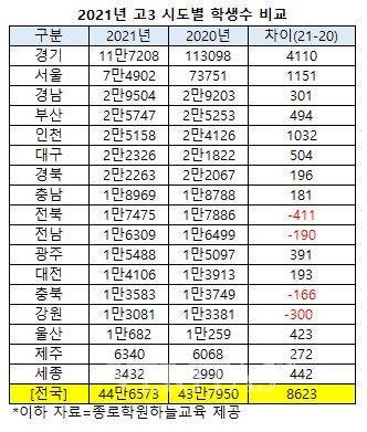 [베리타스알파=강태연 기자] 올해 고3 학생 수는 44만6573명으로 지난해 43만7950명과 비교해 8623명 증가했지만 비수도권 대학의 신입생 충원율 미달은 계속될 것으로 보인다. 지역별로 수도권 지역은 21만7268명으로 전년 대비 6293명 증가했지만, 비수도권 중 강원 충북 전북 전남은 전년 대비 인원이 감소한 것으로 나타났다. 2022대입에서도 수도권과 비수도권 지역의 대학 신입생 충원율의 격차는 여전하고, 특히 지역별 전북 전남 강원 충북 지역 대학의 신입생 충원 어려움은 가속화할 것으로 예상된다. 5일 종로학원하늘교육(종로학원)은 이 같은 내용을 담은 ‘2021 전국 초중고 교육통계 상세분석’을 공개했다.