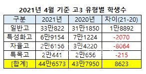 고교유형별로는 일반고가 33만822명으로 가장 많다. 특성화고 6만9154명, 자율고 2만6156명, 특목고 2만441명 순이다. 일반고는 전년 31만1850명과 비교해 1만8892명(6.1%p) 증가한 데 반해 특성화고 자율고 특목고는 전년 대비 인원이 줄었다. 특성화고는 전년 7만1224명보다 2070명(2.9%) 감소, 자율고는 전년 3만4220명보다 8064명(23.6%) 감소, 특목고는 전년 2만656명보다 215명(1%) 감소했다. 특히 자율고 학생 수가 대폭 감소한 것은 2021학년부터 종전 자공고가 일반고로 상당수 전환했기 때문이다. 자공고는 2020년 107개교에서 2021년 72개교로 35개교 감소했다.