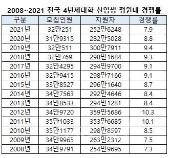 2021학년 4년제 대학 신입생 정원내 평균 경쟁률은 7.9대1(정원내 총 모집인원 32만251명/지원자 252만6248명)로 전년 8.8대1보다 하락했다. 2010년 이후 가장 낮은 기록이며 총 지원자 수로는 2008년 이후 역대 최저 기록이다. 2022수시 총 모집인원은 26만2378명으로 전체 모집인원(34만6553명)의 75.7%다. 전년도(2021) 수시 인원 26만7374명, 전체 모집인원의 77.0%와 비교하면 소폭 감소(1.3%p)했다.