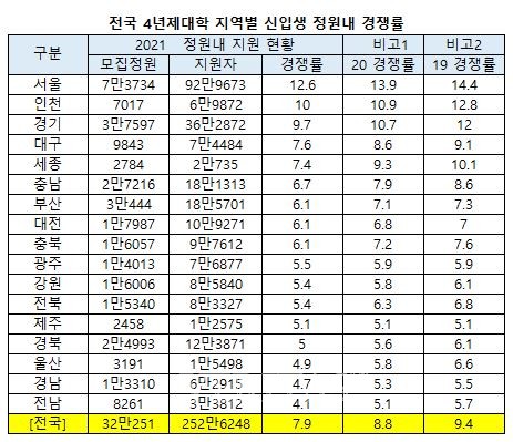 <2021 전국 4년제 대학 신입생 경쟁률 7.9대1.. 수도권만 평균 경쟁률 이상 기록>