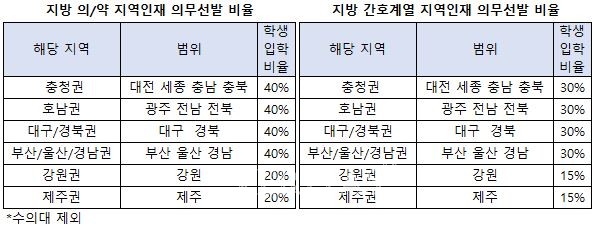 <다시 30%/15% 적용 간호계열, 지방90개교 의무선발 비중 지역인재 2296명.. 적용 전 1350명>