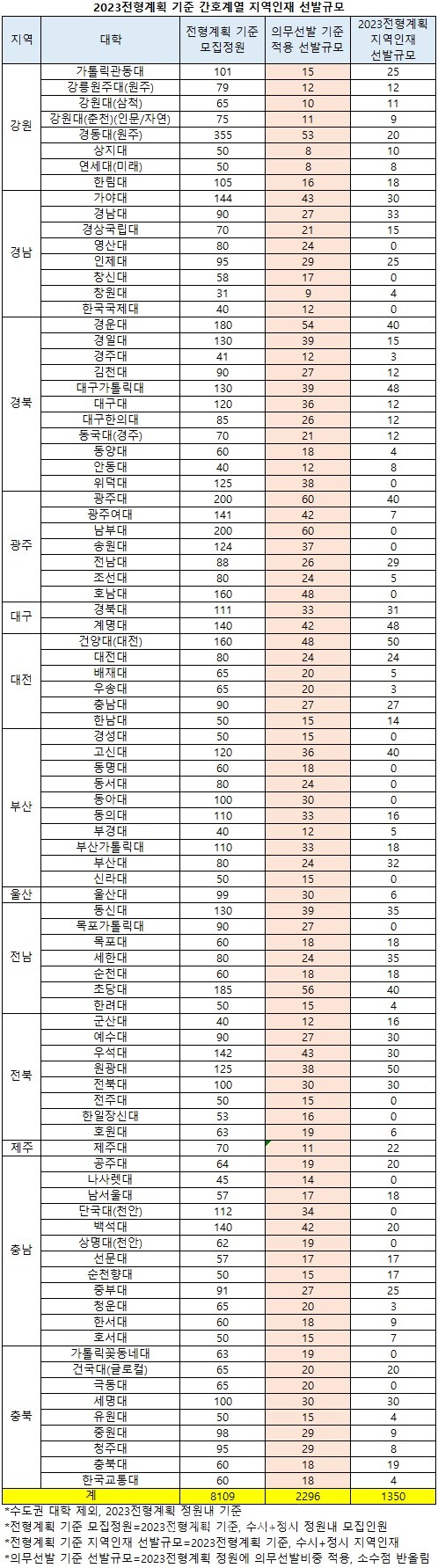 2023대입부터 적용되는 간호계열 지역인재 의무선발 비중을 2023전형계획 기준 모집정원에 적용하면, 4년제 대학 지역인재 선발규모는 2296명으로 나타났다. 2022대입과 비교하면 1.9배 이상 확대되는 셈이다. 40%로 확대됐을 시 3053명에서 757명 줄어든 규모다. 2022대입에서는 수시에서 1189명, 정시에서 11명 선발해 총 1200명을 모집한다. 2023전형계획 기준 비수도권 90개교 모집정원은 8109명이며, 기존 의무선발 내용이 포함되지 않은 전형계획상 지역인재 선발규모는 1350명이다.