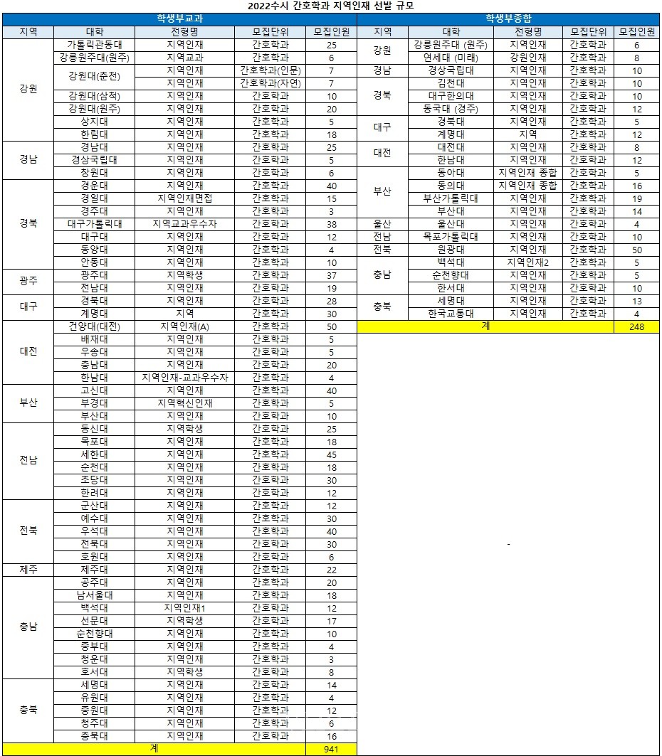 2022대입에서 4년제 대학 간호학과는 115개교가 1만4명을 모집한다. 서울권 상위대 중에서는 경희대 고려대 서울대 연세대 이화여대 중앙대 한양대의 7개대학이 간호학과 신입생을 선발한다. 서울권 대학 중에서 간호학과 모집을 실시하는 대학은 12개교이며, 정원내 963명을 선발한다. 경기/인천 지역은 13개교가 965명, 지방권은 91개교가 8076명을 선발할 예정이다.