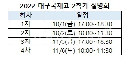 [베리타스알파=김하연 기자] 대구국제고는 2022학년 2학기 학교설명회 진행계획을 최근 밝혔다. 설명회는 중학생과 학부모, 교사 등을 대상으로 10월1일부터 11월6일까지 총4회 대구국제고 본관에서 회차별 40명 내외 총 160명을 모집한다. 1차는 10월1일 오후5시부터 6시30분까지, 2차는 10월2일 오전10시부터 11시30분까지, 3차는 11월5일 오후5시부터 6시30분까지, 4차는 11월6일 오전10시부터 11시30분까지다.