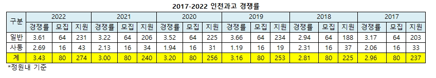 [베리타스알파=김하연 기자] 2022학년 인천과고 경쟁률이 상승했다. 8일 원서접수를 마감한 인천과고 경쟁률은 3.43대1을 기록했다. 최근 6년간 가장 높은 경쟁률이다. 인천과고 경쟁률은 6년간 2017학년 2.96대1, 2018학년 2.81대1, 2019학년 3.16대1, 2020학년 3.2대1, 2021학년 3대1의 추이다.