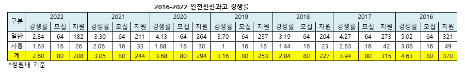 일반전형은 64명 모집에 182명이 지원했다. 최종경쟁률 2.84대1이다. 지난해 3.3대1에 경쟁률에 비하면 하락했다. 2016학년 인천진산 일반 경쟁률은 무려 5.02대1에 달했다가 2017학년 4.27대1, 2018학년 3.19대1로 하락했다. 2019학년에는 3.7대1의 경쟁률을 기록해 3년 만에 반등했고, 2020학년에도 4대1의 기록으로 상승세를 이어갔지만 2021학년 3.05대1, 2022학년 2.84대1로 하락세에 접어든 모습이다.