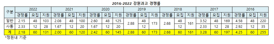 [베리타스알파=김하연 기자] 강원과고 경쟁률이 상승했다. 6일 원서접수를 마감한 강원과고에 따르면 2022신입생 모집 원서접수 결과 최종경쟁률은 2.18대1로 나타났다. 정원내 60명 모집에 131명이 지원한 결과다. 지난해 2대1(모집 60명/지원 120명)보다 지원자가 11명 늘었다. 일반전형과 사회통합전형 모두 경쟁률이 상승했다. 일반은 지난해 2.08대1(48명/100명)에서 올해 2.15대1(48명/103명), 사회통합은 지난해 1.67대1(12명/20명)에서 올해 2.33대1(12명/28명)로 상승했다.