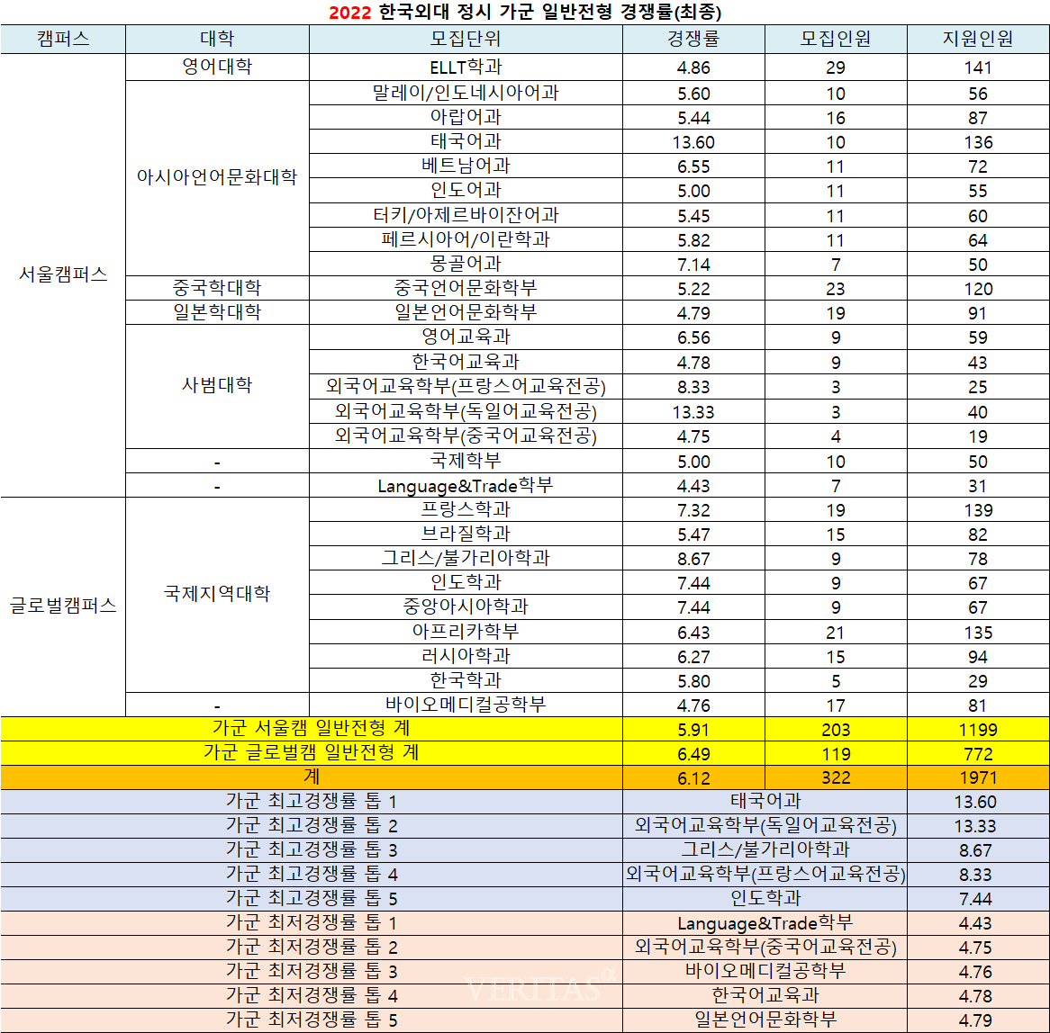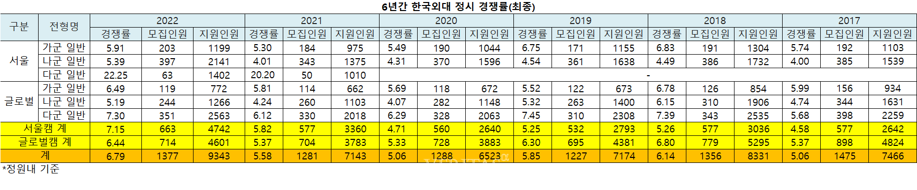 [베리타스알파=권수진 기자] 2022정시 한국외대 최종경쟁률(이하 정원내)은 6.79대1(모집1377명/지원9343명)로 지난해 5.58대1(1281명/7143명)보다 상승했다. 서울캠은 7.15대1(663명/4742명), 글로벌캠은 6.44대1(714명/4601명)로 지난해 5.82대1, 5.37대1보다 각 상승했다.