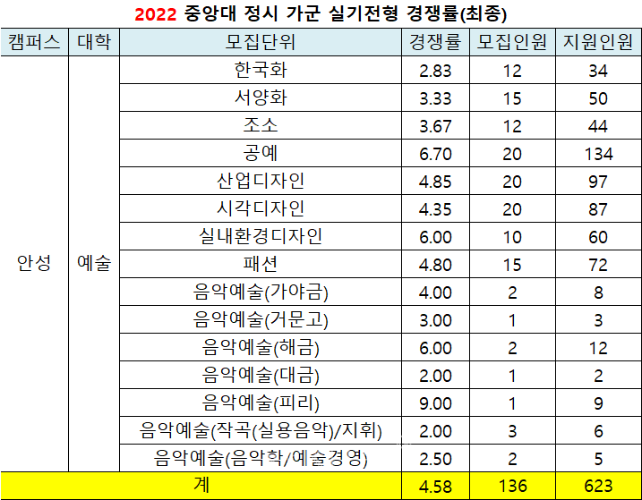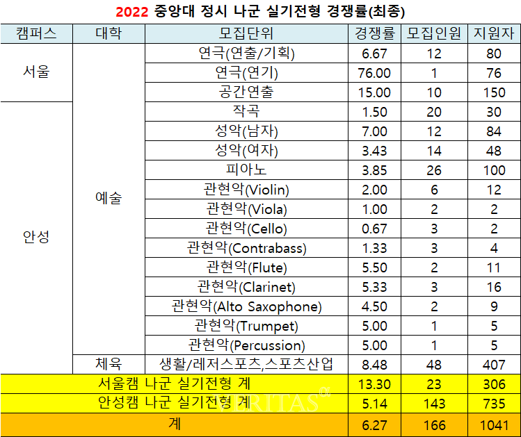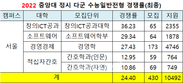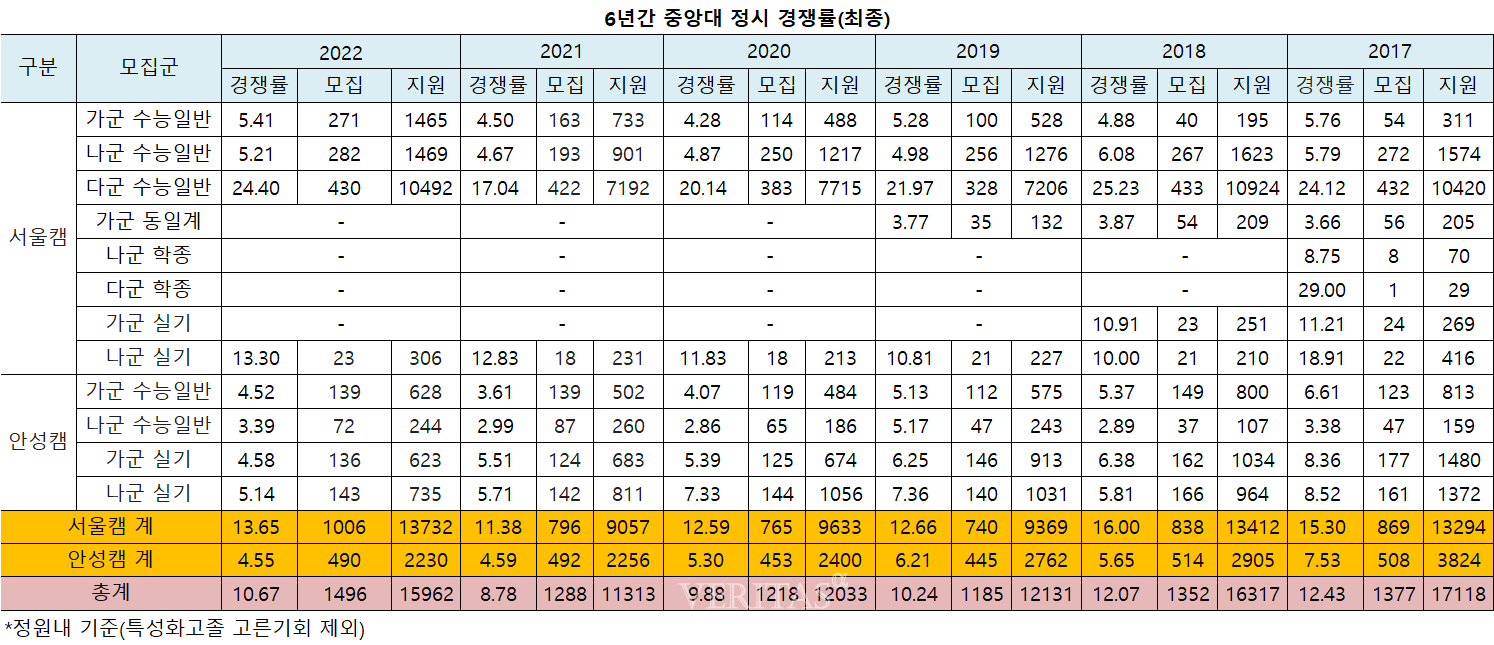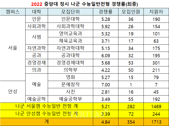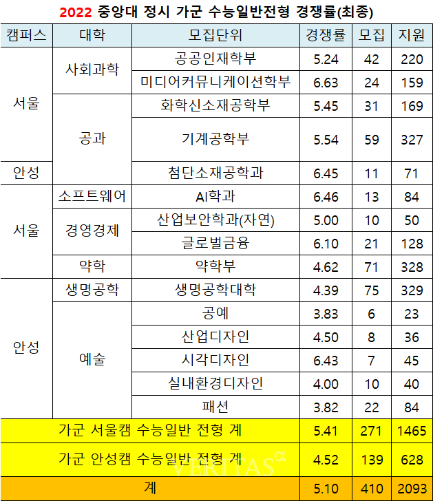 [베리타스알파=권수진 기자] 2022정시 중앙대 최종경쟁률(이하 정원내 기준)은 10.67대1(모집1496명/지원1만5962명)로 지난해 8.78대1(1288명/1만1313명)보다 상승했다. 지난해보다 모집인원이 확대됐지만 그보다 더 많은 지원자가 몰렸다. 캠퍼스별로는 서울캠이 13.65대1, 안성캠이 4.55대1을 기록했다.
